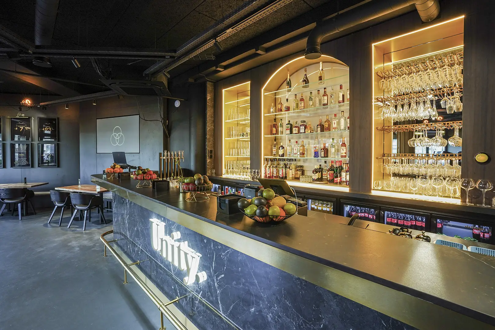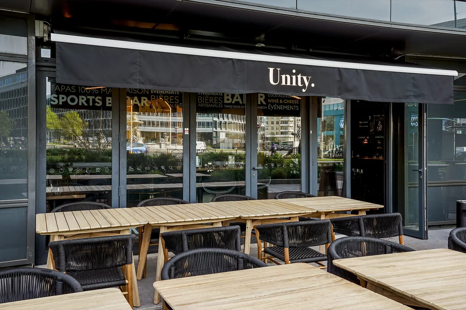 Nous avons réalisé l’aménagement complet d’un bar/restaurant, dans un style mêlant modernité et esprit sportif.